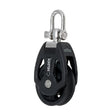 Acetal sheave plain bearing block with stainless steel strap for strength. Stiff glass fibre cheek reinforcement, reinforced composite & sliding swivel lock.