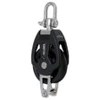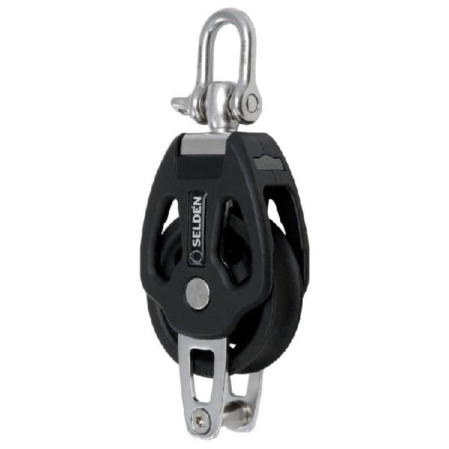 Acetal sheave plain bearing block with stainless steel strap for strength. Stiff glass fibre cheek reinforcement, reinforced composite & sliding swivel lock.