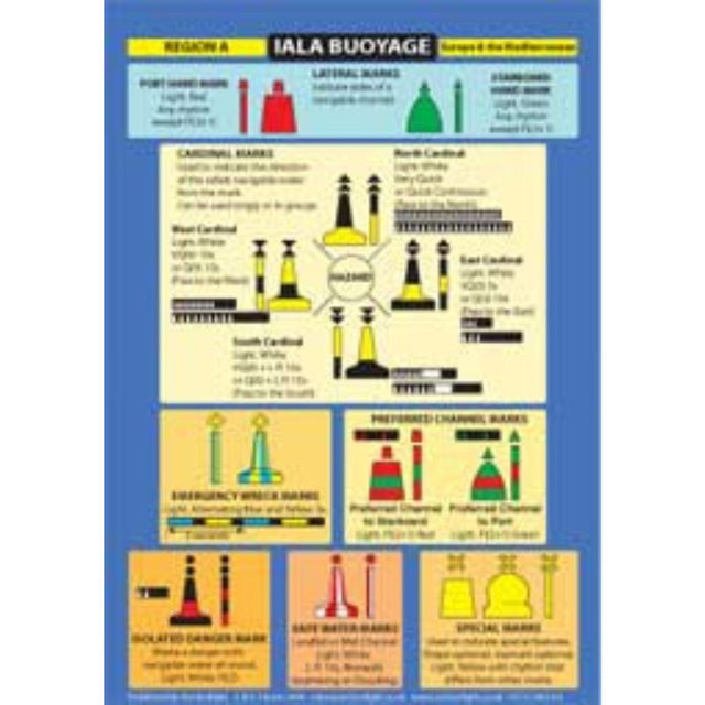 Buoyage/ Distress signals laminated card. Side One - IALA Buoyage - Region A and the Mediterranean, Port and Starboard Lateral Marks, Cardinal Marks, Isolated Danger Marks, Safe Water Marks, Special Marks, Preferred Channel Marks, Emergency Wreck Marks, Light sequences. Distress Signals: Side two - This shows the distress signals likely to be of most relevance to small craft, Fog Horn, SOS Flags, N over C, Flares, Outstretched Arms, Square Flag above or below round ball, EPIRB and Mayday Procedure. Printed using light-fast ink and encapsulated with a heavy duty plastic for cockpit use and abuse. Keep another in the Grab Bag. Ideal for training and instructional purposes. See details of Imray App Rules and Signals