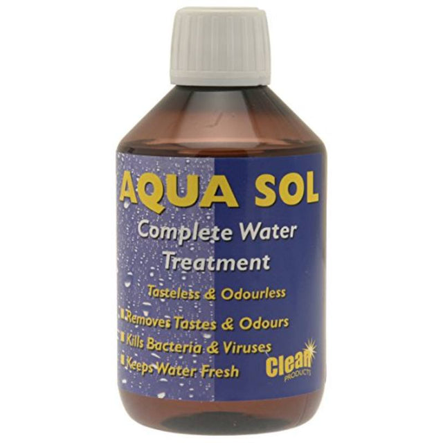 Aquasol is a powerful biocide which destroys all water borne bacteria and viruses. In addition it removes tastes and odours caused by plastics, chlorine, GRP and metals, keeping water fresh for a very long time. Aquasol is approved by the DOE . The size 250ml will treat 625l of water.
