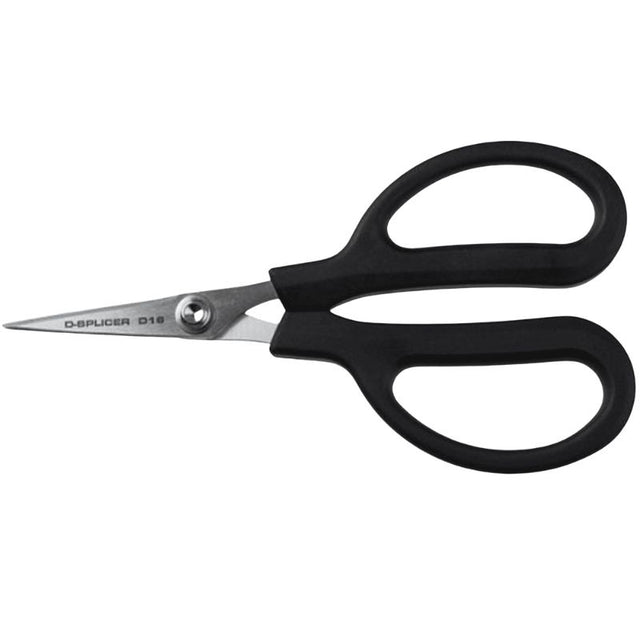 D-SPLICER scissors. The length of the cutting blades are approximately 45mm. They are laser cut and have an excellent grinding profile. Specially designed for cutting strong fibres like HMPE, Dyneema®, Vectran® and Stirotex®.